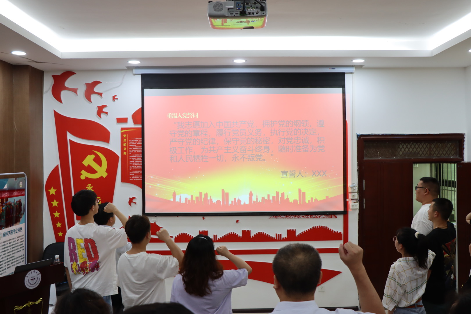 刚加入中国共产党的13名党员面对鲜艳的党旗,举起右手,在杨国强的带领下进行了庄严的宣誓,全体师生党员重温入党誓词;为进一步加深对中国共产党誓词的理解和熟记,吴彦嫢为大家上了微型党课--《中国共产党誓词的演变》;全体党员随着优美的旋律和节拍,配合激情澎湃、振奋昂扬的画面,合唱了歌曲《我宣誓》,唱出了对党的无限深情,唱响了永远跟党走、奋进新时代的主旋律。
