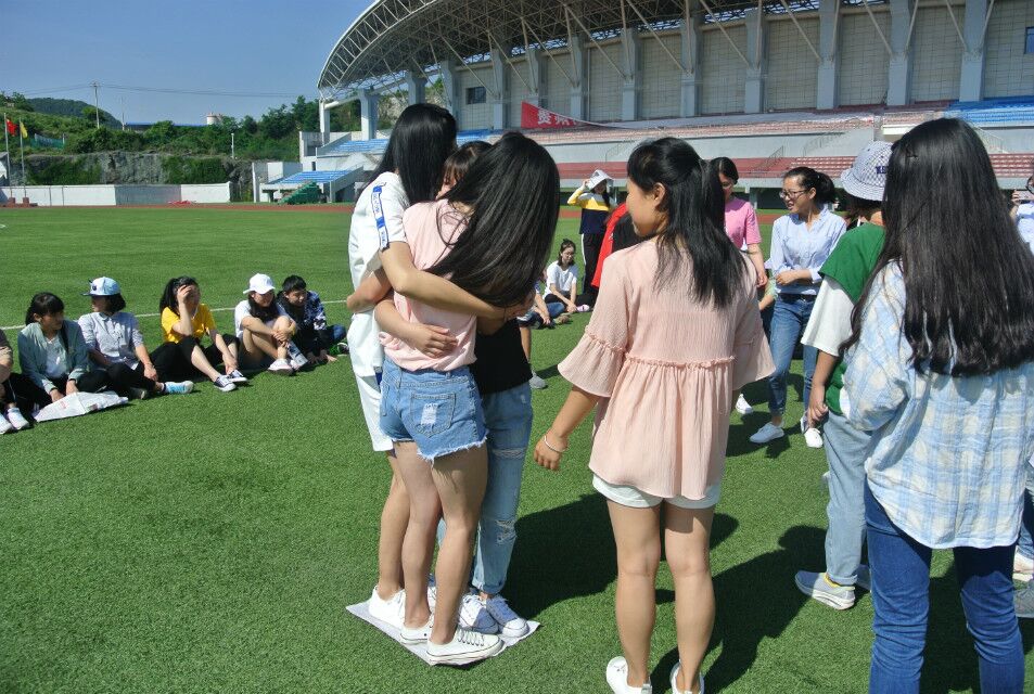烈日炎炎,难抵同学们如火的热情。此次活动分为以下三项: 第一项:“纸上活人”,同学们踮起脚紧紧的抱在一起,只为不从一张小小的纸上掉下去 。 第二项:挑战同学们的速度与身体平衡。后一个同学们手搭着前一个的肩,后一个同学提着前一个同学的裤脚,在操场上单脚奋力地蹦跳着,同时还要注意与其他同学的配合,只为早一刻到达终点。