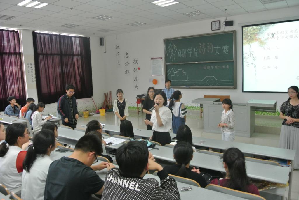 共有14名选手参与比赛。第一轮比赛中,十四位选手争分夺秒,沉着冷静地作答,体现了“博观而约取,厚积而薄发”的深厚积累。在第二环节飞花令的比拼中,将大赛氛围推向高潮,选手们你来我往激扬诗句的表现让观众感受到古诗词文化的博大精深。赛场上不时响起观众热烈的掌声和喝彩声,经过激烈的比拼,有五位同学脱颖而出,并继续在抢答题决赛环节中争逐胜负。在此环节中,选手们严谨迅速的对题目进行判断快速作答。决赛环节的几度加时,也让全场同学们为之兴奋。最终比赛结果出炉,15级姜凉,16级段李欢和胡海琳三位同学取得优异的比赛成绩,她们将代表国产视频