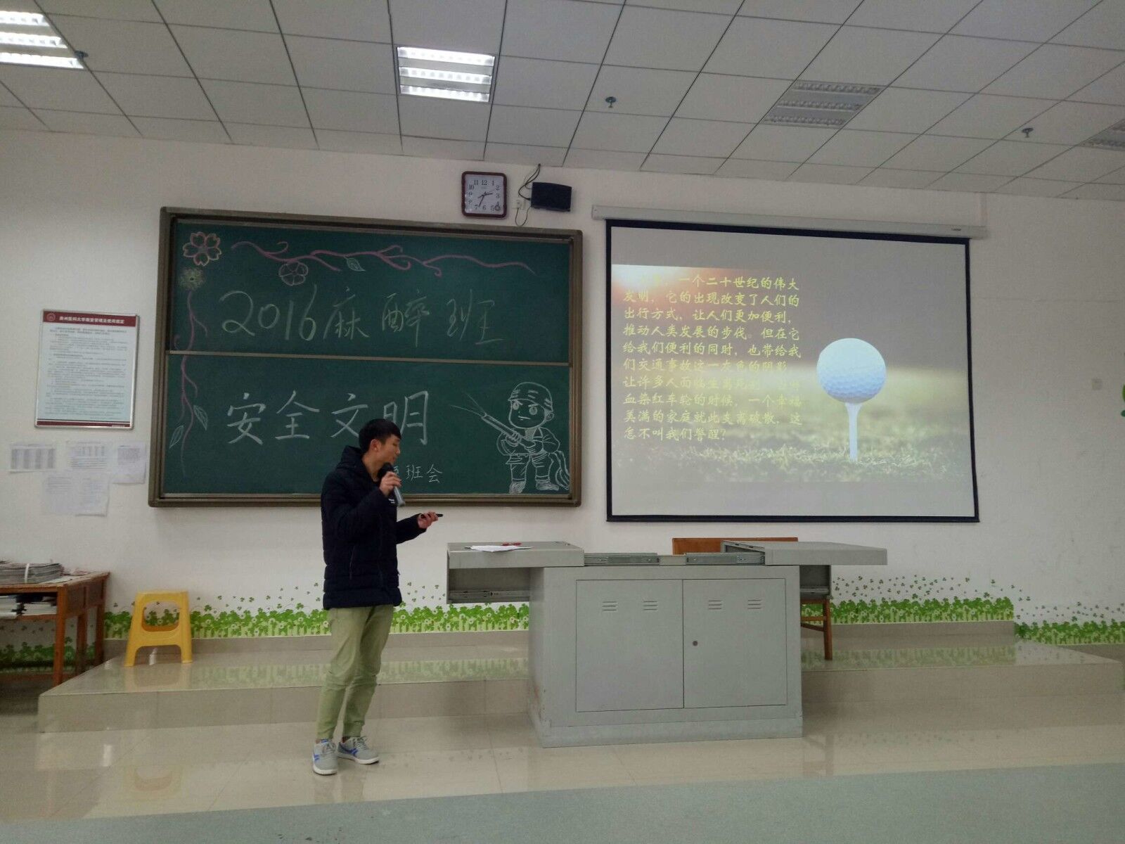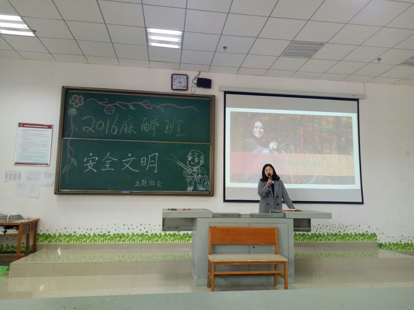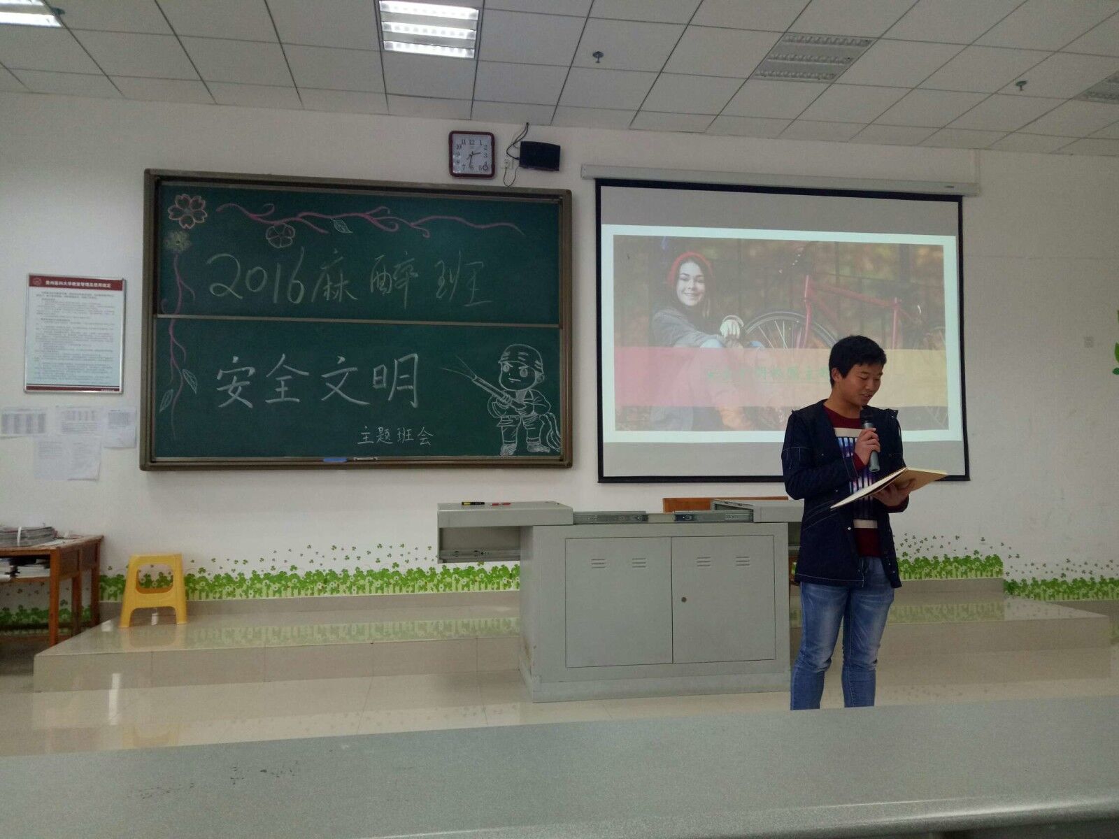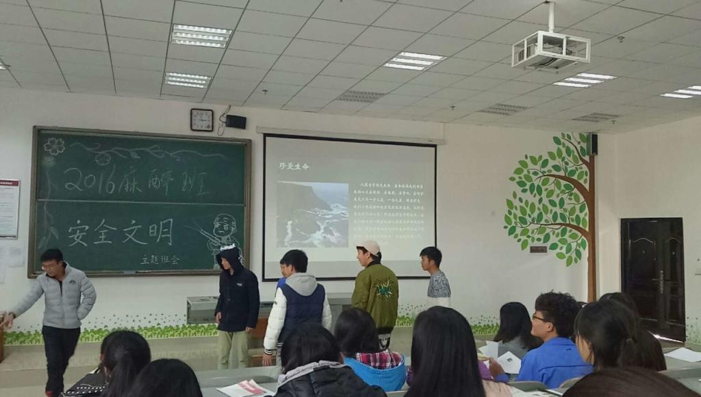 2016级在南校区4402教室开展“安全文明”主题班会。辅导员徐青及全体同学共同参与,班会由班长夏明忠主持。