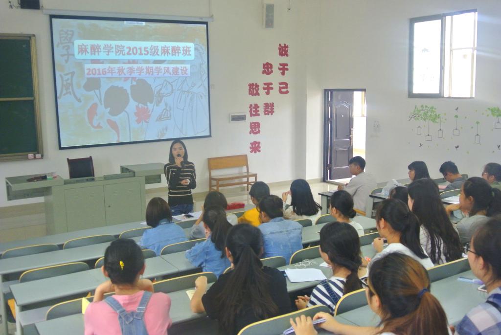 2015级麻醉班于9月23日下午14:00在南校区7607开展学风建设主题班会。辅导员周霁及2015级全体学生参与此次主题班会,活动由学习委员杨鉴主持。