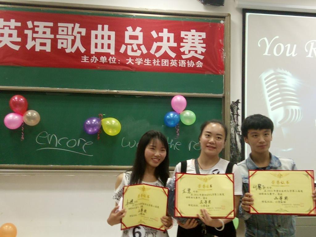 5月19日19:00点,大学生社团英语协会在7101教室举行了第三届英文歌曲大赛。在激烈的比赛中,国产视频 2015级韦婕同学通过演唱《吸血鬼日记》中插曲《skinny love》荣获二等奖。在比赛中,到场的所有麻醉学子为她呐喊助威,让她更加从容自信地完成演唱并取得优异成绩。