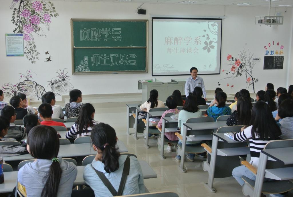 此次交流会主讲人高鸿主任从麻醉学专业的基本概况、师资力量、发展前景、就业方向和学习要求等作了全面介绍,从培养目标、培养要求、课程设置、培养方式、专业特色等方面对专业人才培养方案进行了详细解读,引导与鼓励同学们坚定信心,科学规划大学生活,把握机遇,努力成功成才。为同学们深入浅出地讲解了麻醉学专业前景、当前热门的考研信息、以及有效的学习方法等诸多实用性较强的合理化建议。在互动环节,学生们畅所欲言,纷纷就教学、学习、考研、四六级英语考试,住院医生规范化培训,就业形势及学生管理等方面提出了问题;高鸿主任幽默风趣地针对具体问题进行了答疑解惑,同学们一次次会意的笑声和热烈的掌声,足以证明此次交流会取得了圆满成功。