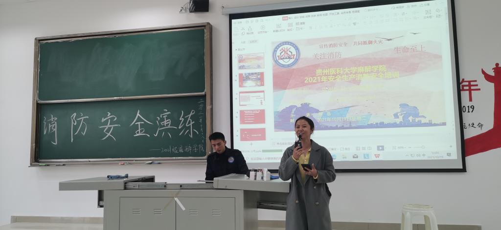 于10月19日在南校区7301教室开展消防安全知识专题培训及疏散演练活动。活动特邀贵阳市航安消防中心罗教官进行培训,学院党委副书记吴彦嫢、分团委副书记徐青、辅导员陈燕秋以及2021级麻醉班全体同学参与活动。
