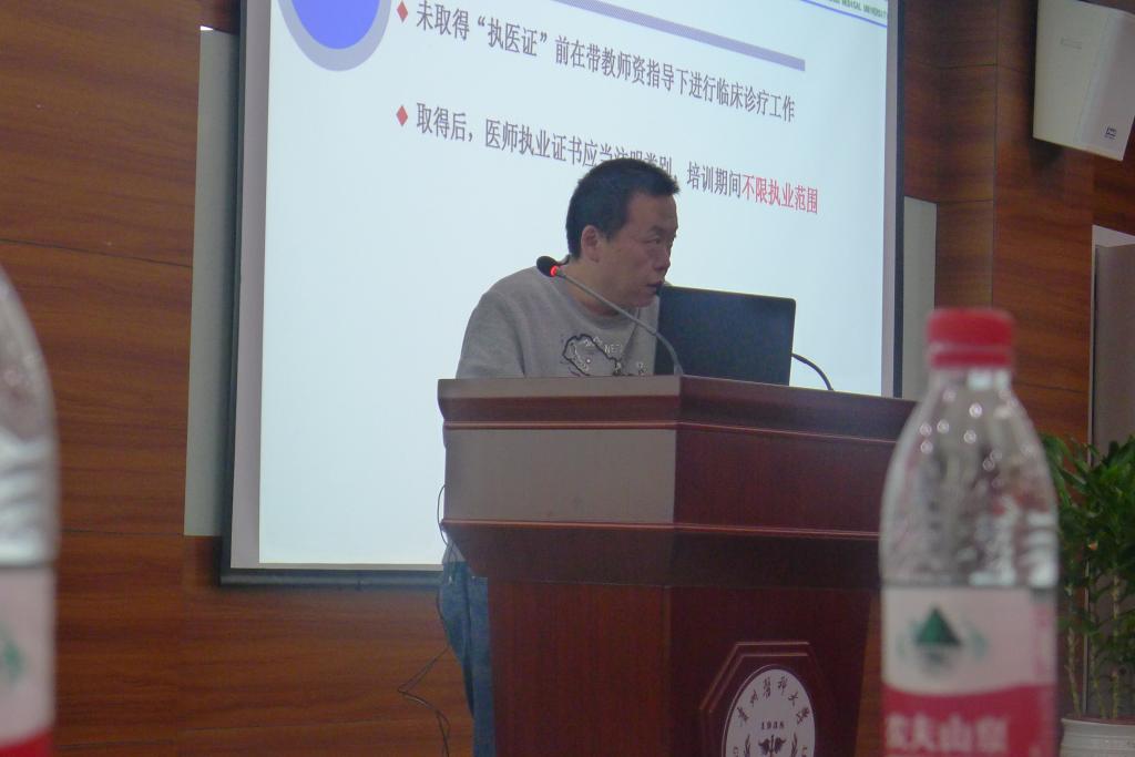 曾祥刚从麻醉学专业毕业前就业指导、住院医师规范化培训简介等方面为同学们进行讲述,具体介绍了麻醉学毕业生的毕业去向、住院医师规范化培训招生情况、附属医院麻醉专业培训基地的管理及麻醉规培医师的学习考核要求,嘱咐同学们夯实基础、努力学习,实现梦想。