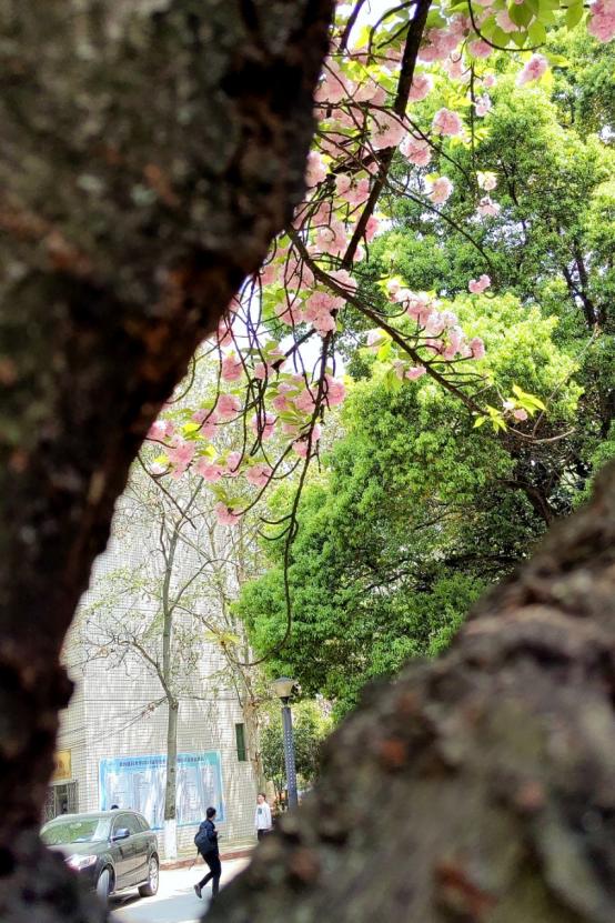 透过树干缝隙拍摄的校园一角,行人、车辆与繁花绿树交织,充满生活气息;