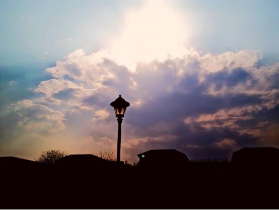 路灯矗立在光影交错的天空下,阳光穿透云层,营造出宁静而温暖的氛围;