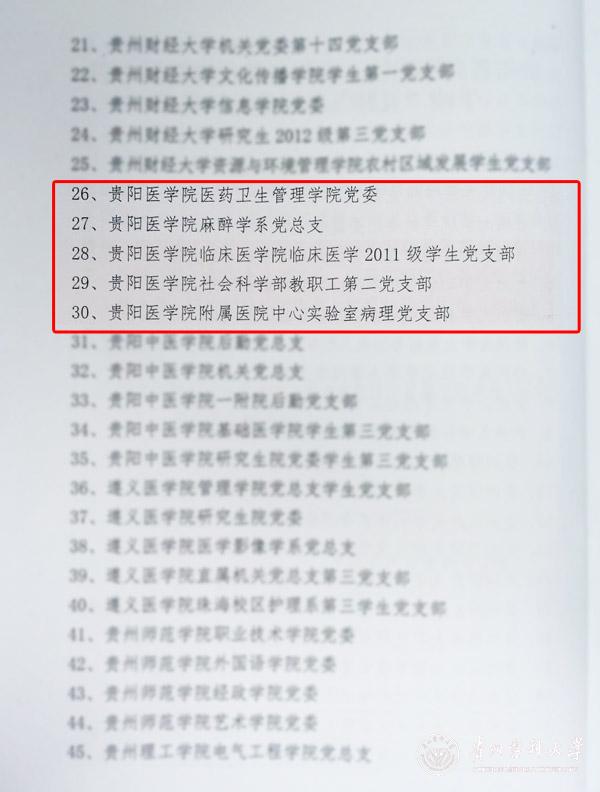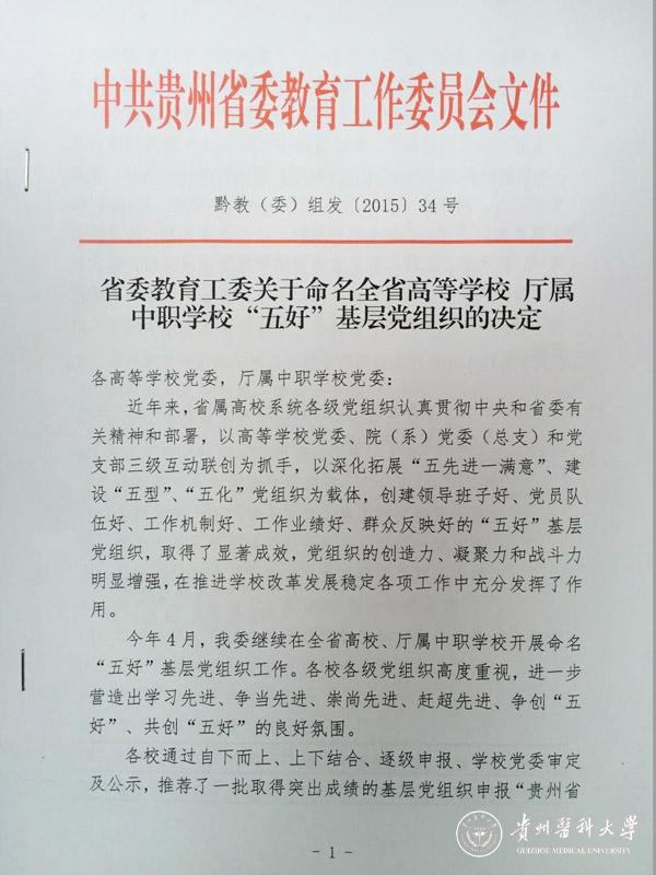 近日,省委教育工委下发了《关于命名全省高等学校厅属中职学校“五好”基层党组织的决定》(黔教(委)组发〔2015〕34号),命名表彰了一批全省高校“五好”基层党组织。我校医药卫生管理学院党委、麻醉学系党总支、临床医学院临床医学2011级学生党支部、社会科学部教职工第二党支部、附属医院中心实验室病理党支部等5个基层党组织荣获全省高校“五好”基层党组织称号。