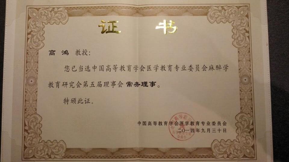 2014年11月30日麻醉学系高鸿主任在全国高等教育学会医学教育专业委员会麻醉学教育研究会中荣任第五届理事会常务理事。