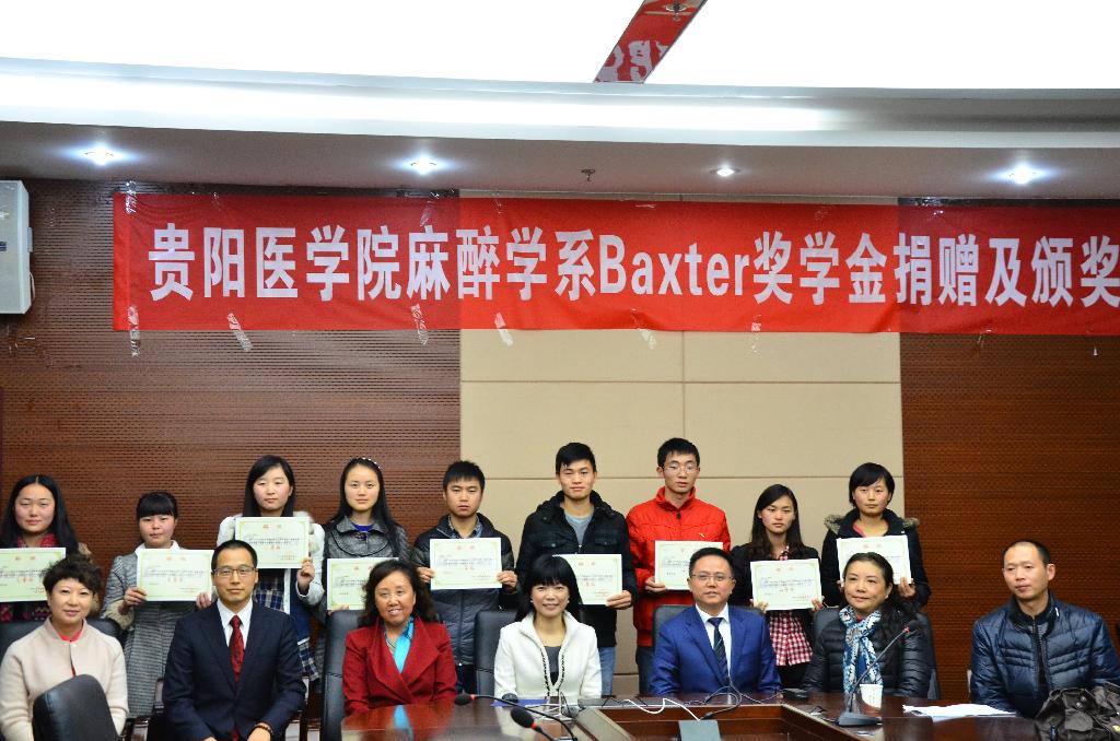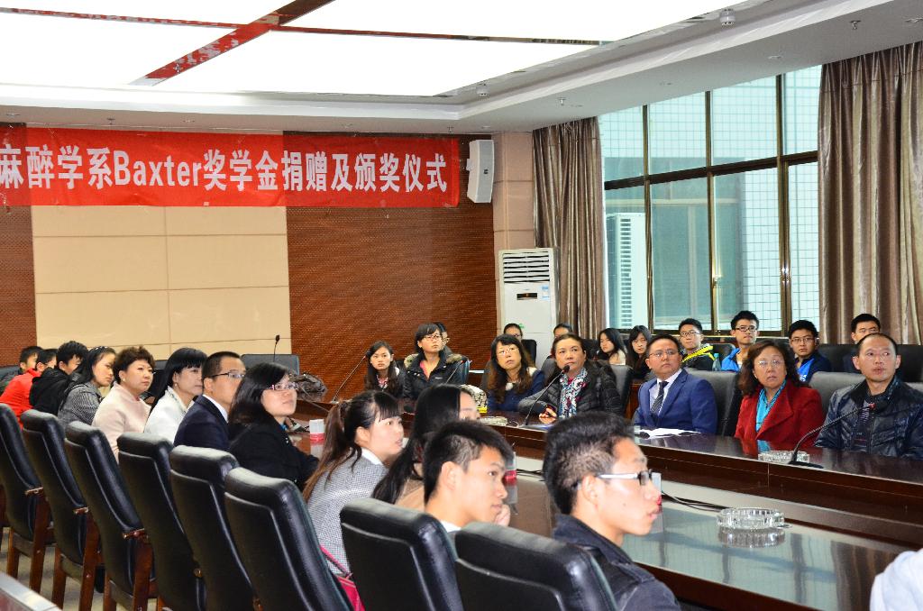 2014年11月26日下午4点30分,麻醉系在北京路校区行政楼六楼连廊会议室举行了“Baxter奖学金”捐赠及颁奖仪式。出席本次仪式的人员有:百特中国特殊药品部销售市场总监刘轶盈、全国销售总监俞祚禧、百特华南地区销售经理赵晶、贵州地区高级客户专员姚文红、贵阳医学院资助中心张晓华主任、学工处周辉副处长、麻醉学系党总支书记刘建华、麻醉学系副主任高鸿、临床麻醉教研室副主任刘艳秋、学生科科长莫海畬、辅导员周霁及35名获奖学生,捐赠及颁奖仪式由麻醉学系党总支书记刘建华主持。