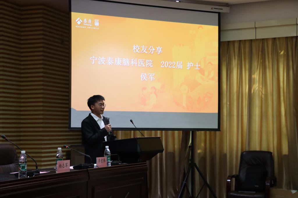 宣讲会上,宁波泰康脑科医院招聘团队负责人杨志军详细向在场人员介绍了宁波泰康脑科医院的医疗配备、学科设置、医务人员组成以及未来发展定位等概况,诚挚邀请广大毕业生到医院实习和工作。随后,宁波泰康脑科医院护理部医疗之星侯军作为校友分享了他在医院的学习、工作和生活,鼓励学友到医院去创业、就业。
