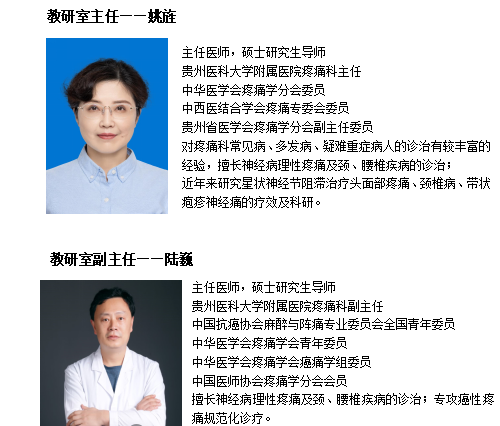 的附属医院,疼痛科承担着疼痛学及麻醉学硕士生、本科生(麻醉、护理、口腔、医学影像、法医)的《疼痛诊疗学》教学,同时负责护理学本科生的临床实习指导以及进修医师的培训工作。教研室立足学科前沿,确立了三大特色研究方向:神经病理性疼痛研究、肌筋膜疼痛综合征研究、癌性疼痛研究。已培养疼痛方向硕士研究生50多人,博士研究生6人。