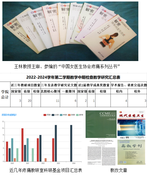在科研方面,科室积极开展基础研究和临床研究,承担了多项国家级、省部级科研项目,在疼痛发生机制、治疗新靶点等方面取得了一系列重要科研成果。近年来,疼痛教研室教师发表论文总40余篇,其中SCI收录10余篇,国家级核心期刊20余篇,独立出版及参与编写教材和、专著、译著及其他系列丛书数本10部以上。主持国家自然科学基金2项,省级重点课题2项,省市级课题10余项,科研经费近200万元。指导学生获得省级以上教学成果奖6项。